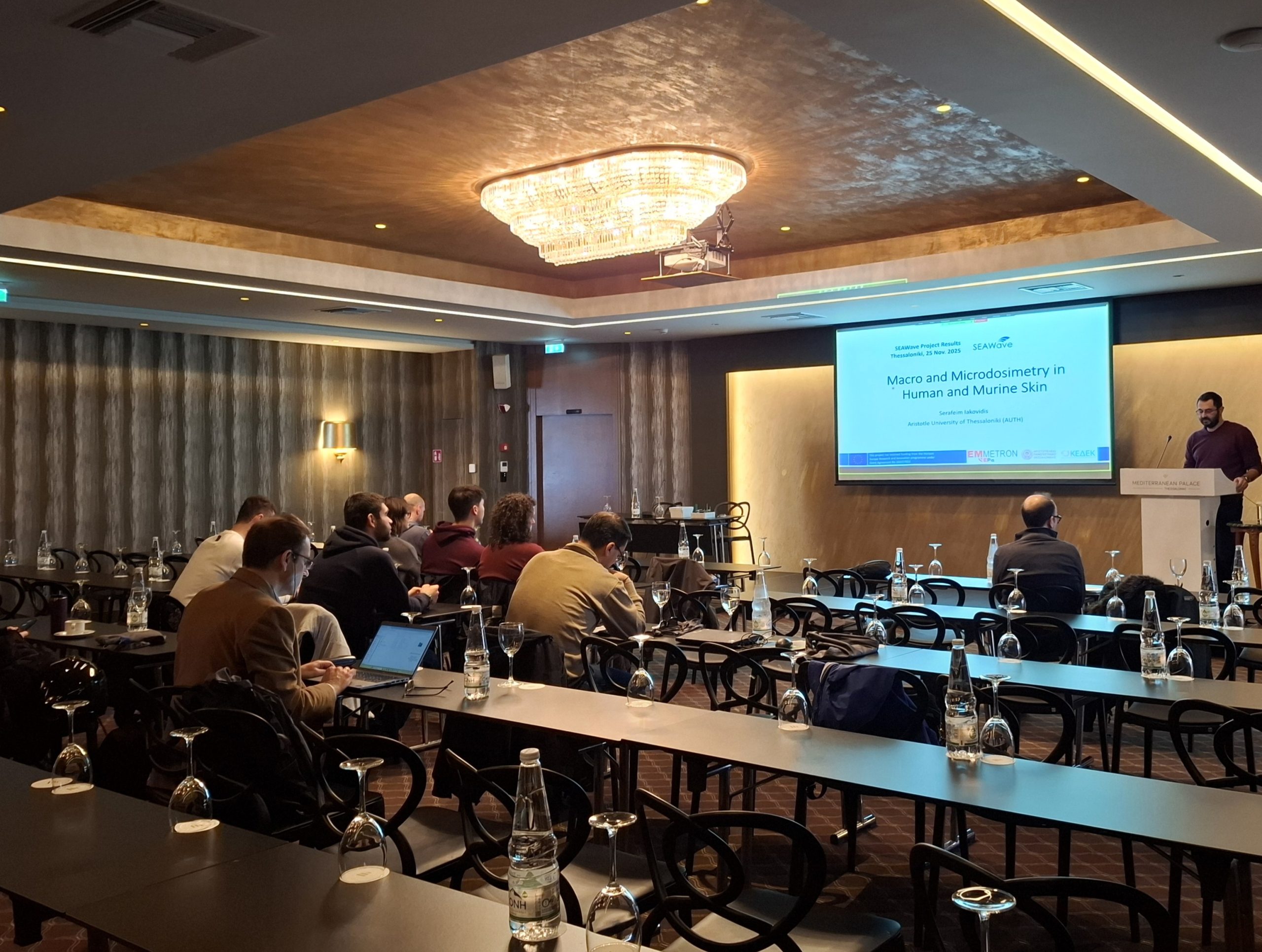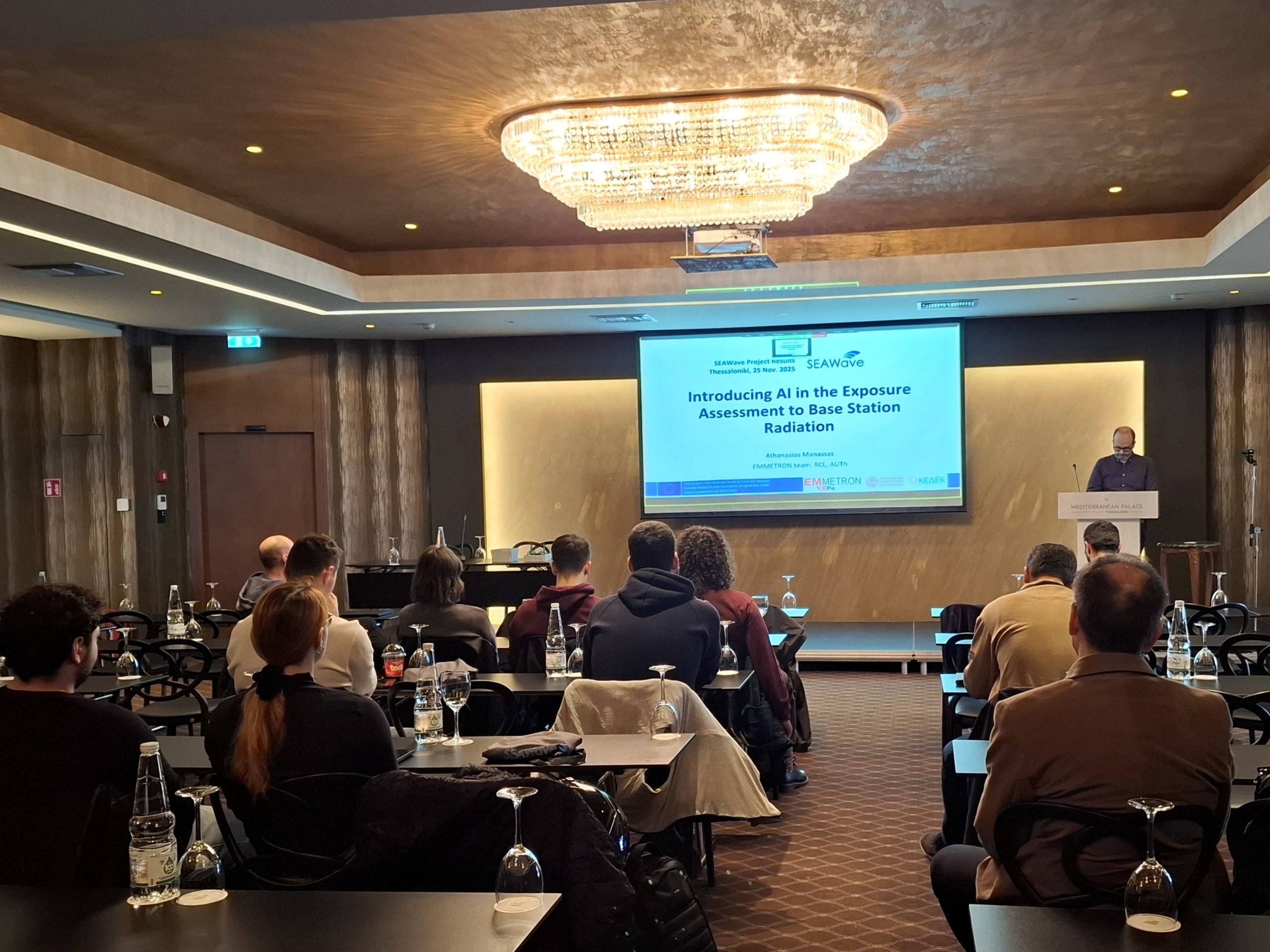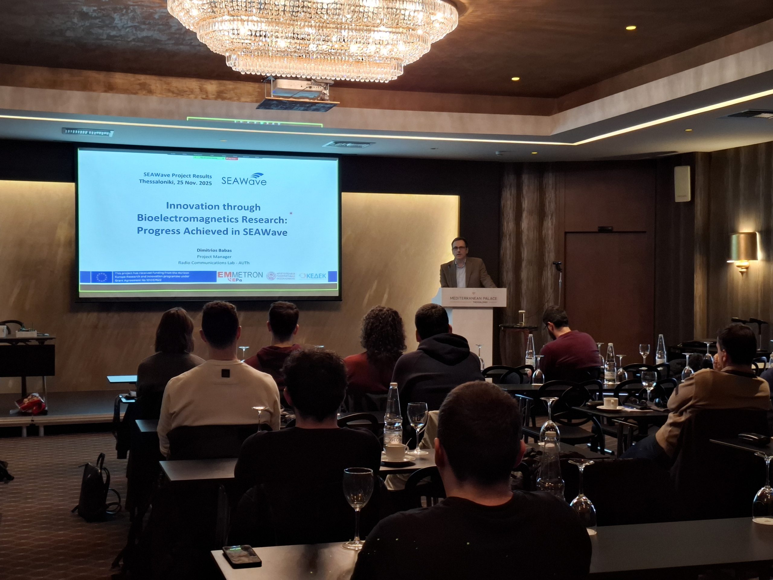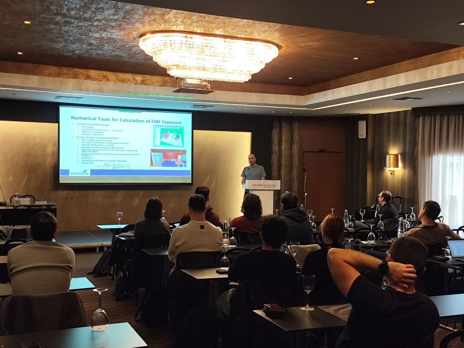 On Tuesday, November 25, 2025, the Aristotle University of Thessaloniki (AUTH) team presented the research results of the SEAWave project to the public in the DIAS hall of the Mediterranean Palace Hotel. Members of the Radio Communications Laboratory of the Department of Physics, AUTH—who played an active role in the international consortium—outlined both the overall achievements of SEAWave and the specific contributions of the AUTH team. During the workshop, the audience was introduced to: